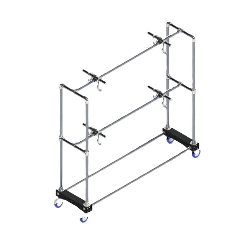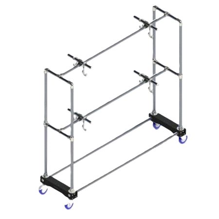 A Meat Rack Trolley designed to carry four bars with lights attached. It has adjustable clamping points and is easily adaptable to suit different storage requirements.