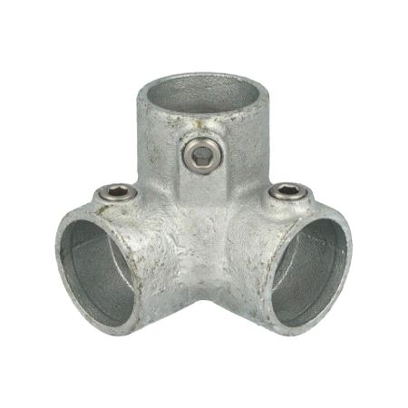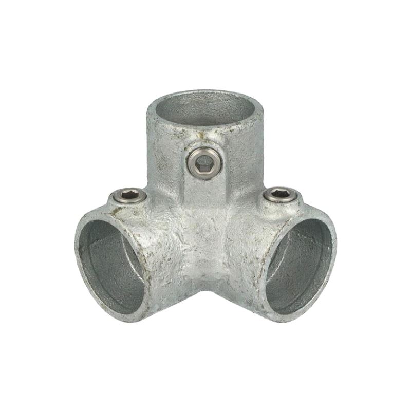A galvanised steel fitting designed to provide a three way 90 degree corner.