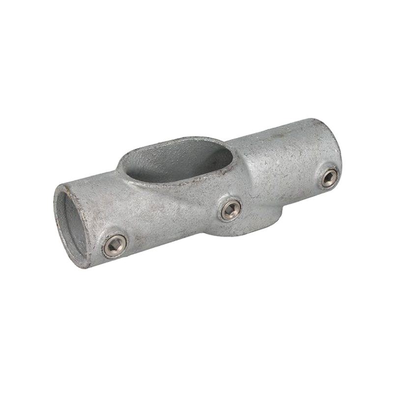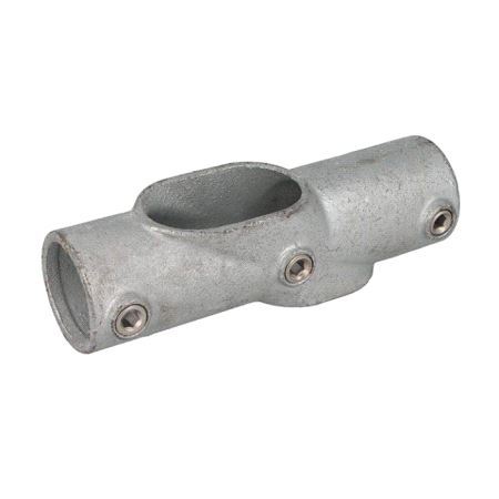 A galvanised steel fitting designed to provide a cross joint between a vertical and two horizontal tubes freely adjustable between 30 and 60 degrees.
