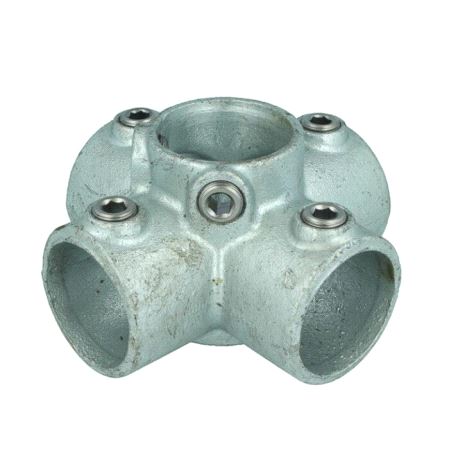 A galvanised steel fitting, designed to be used as a four way cross that enables the vertical to pass through the centre of the fitting. The four outlets then operate at 90 degrees.