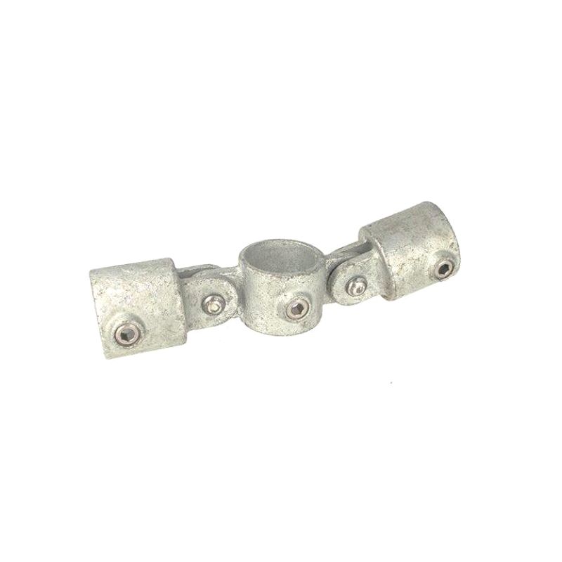 A galvanised steel fitting with the swivel connectors at 180 degrees to each other.