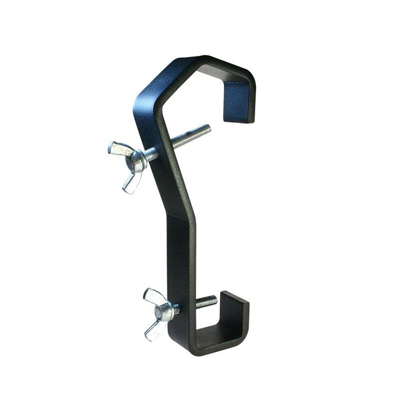 A steel heavy duty double ended parallel hook clamp. Designed to connect two different size bars. One end 63mm to 75mm and the other end 48mm to 51mm. Powder coated black finish.