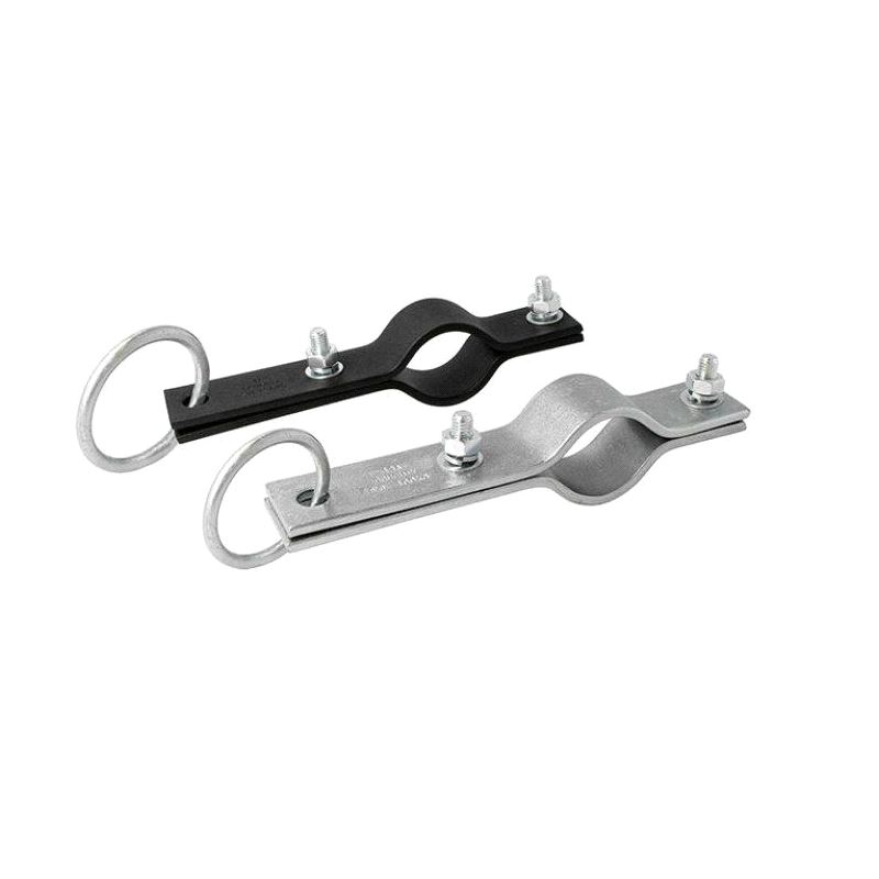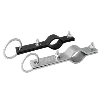 A steel hanging clamp with ring. Ideal to suspend a 48mm diameter tube by hemp or steel wire rope.