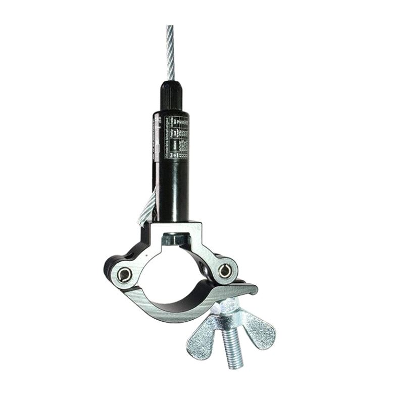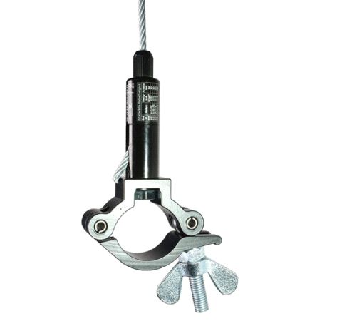 A Type 50SV Reutlinger Cable Holder fitted with a T58081 half coupler and side exit for the wire. Suitable for 4 or 5mm steel wire rope these cable holders have been specifically designed for applications which demand compliance with BGV C1, such as stage productions, fair booths, etc.