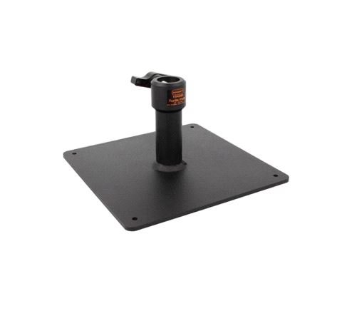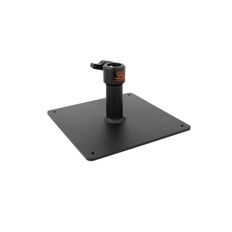 A 230mm X 230mm steel floor plate with a 29mm TV spigot receiver. The turtle plate has 4 x 6mm corner fixing holes.