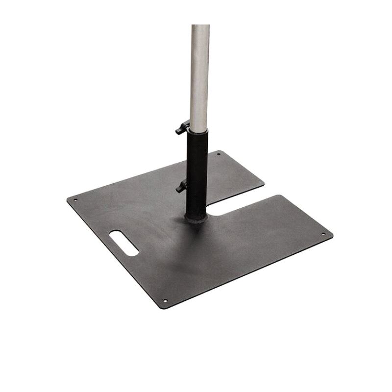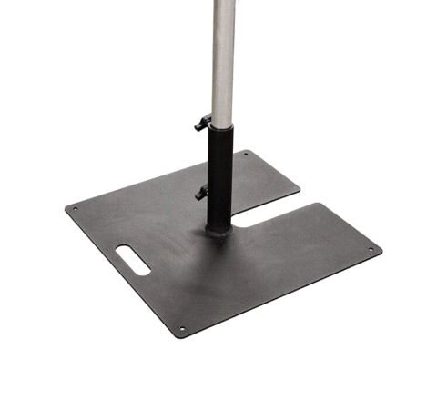 The industry standard. The Doughty Tank Trap provides the means to support a 48.3mm vertical tube or scaffold pole and is ideal for side lighting. Consists of a 600mm square steel plate with a 50mm receiver welded to it. There is a cut out in the base to allow compact stacking for transport and storage.