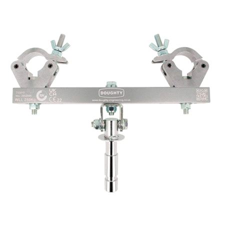 Manufactured from solid high tensile aluminium, the Solid Fixed Truss adaptor features two slimline aluminium half couplers to fit 48mm to 51mm diameter truss tubes and a swivelling 28mm diameter spigot to fit most stand receivers. Suitable for truss with tube centres of 207mm – 339mm.