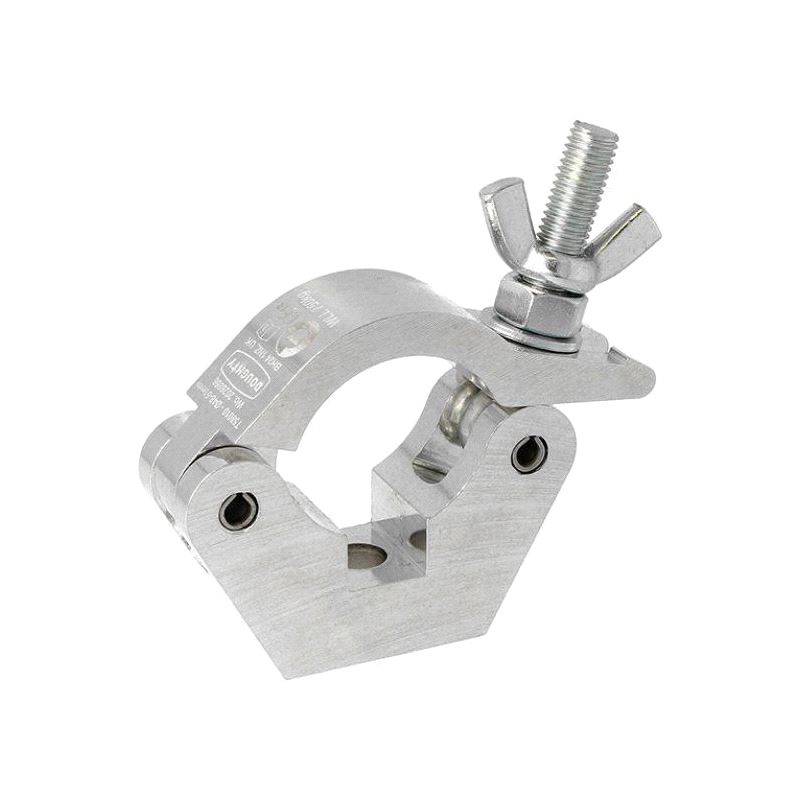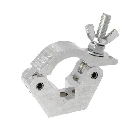 The industry standard slimline half coupler. A high tensile extruded aluminium clamp that is suitable for 48mm to 51mm diameter tubes. It has a WLL of 750Kg and is 30mm wide. Slotted to hold captive an M12 nut or bolt head. Ideal for trussing as it will not damage the cords.