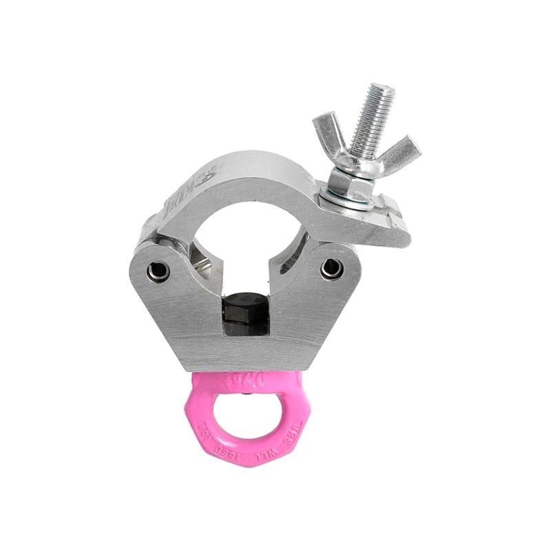 The industry standard half coupler factory fitted with a Rud Pink Eye. A high tensile extruded aluminium clamp that is suitable for 48mm to 51mm diameter tubes and is 50mm wide. The Pink Eye is an articulated M12 Eye Nut with a WLL of 750Kg. It is manufactured from high tensile forged materials and annealed. This product is 100% electromagnetic crack detected in accordance with EN 1677-1. Unlike standard Eye Nuts, the Pink Eye can be used in unfavourable load directions (not permissible for DIN 580). Please note that although the eye is designed to spin 360 degrees to get it in the correct position it is not designed to turn under load as this can lead to the bolt loosening. It has a WLL of 750Kg. Ideal for trussing as it will not damage the cords.