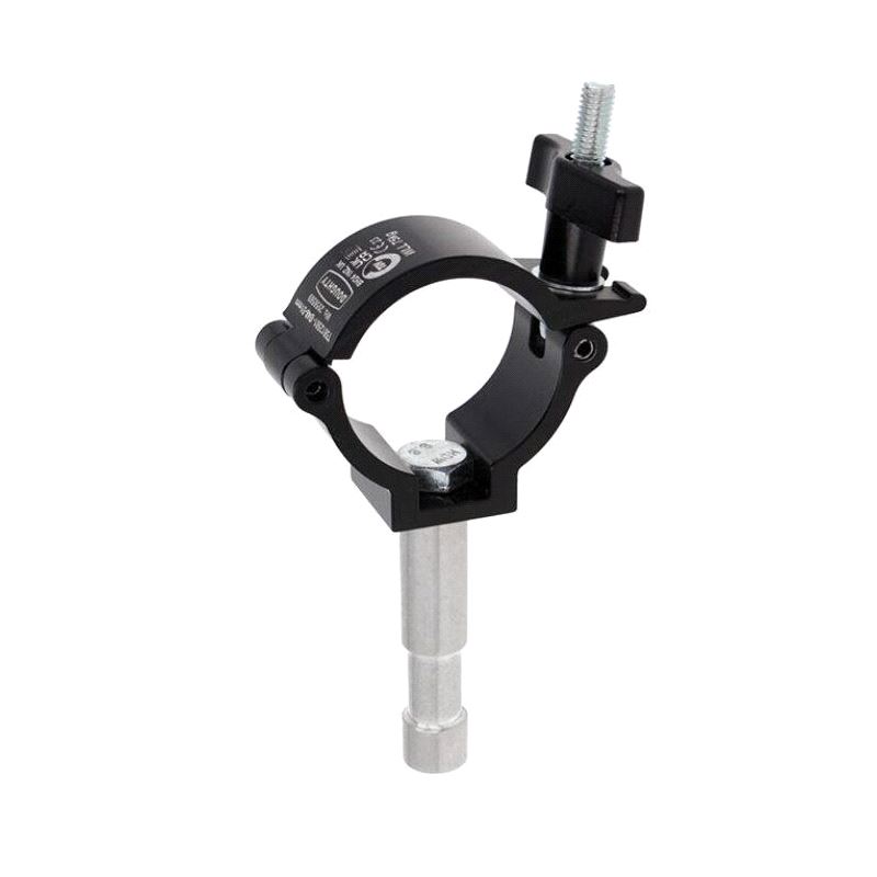 A high tensile extruded aluminium clamp that is suitable for 48mm to 51mm diameter tubes. It has a WLL of 100Kg and is 30mm wide factory fitted with a 16mm diameter spigot. Ideal for trussing as it will not damage the cords.