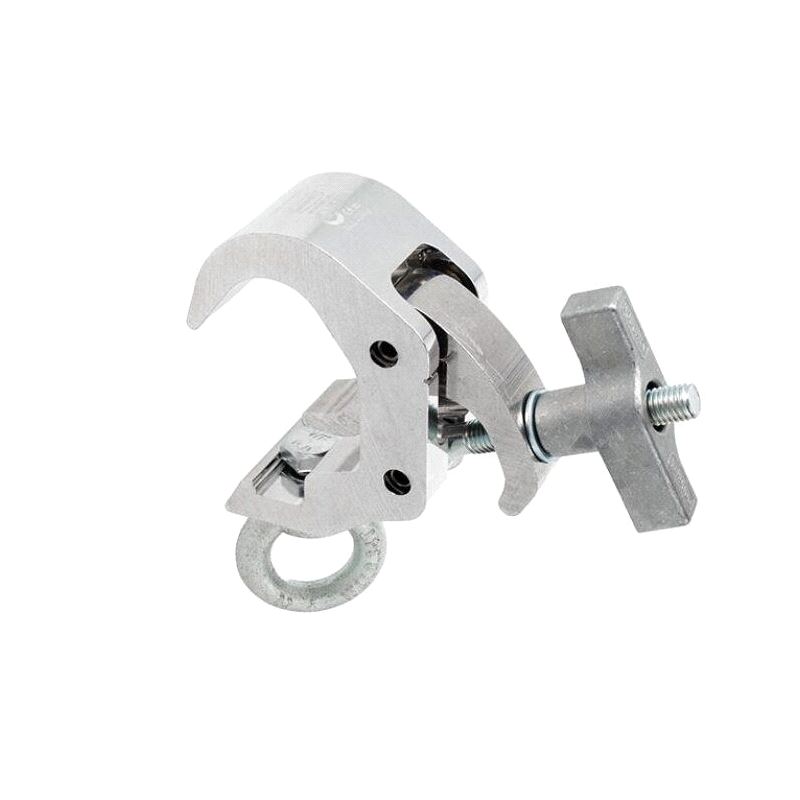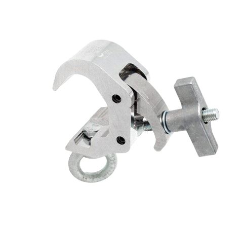 A high tensile extruded aluminium quick trigger clamp that is suitable for 38mm to 51mm diameter tubes. It has a WLL of 250Kg and is 50mm wide, factory fitted with an Eye Nut. Ideal for use with trussing as it will not damage the cords.