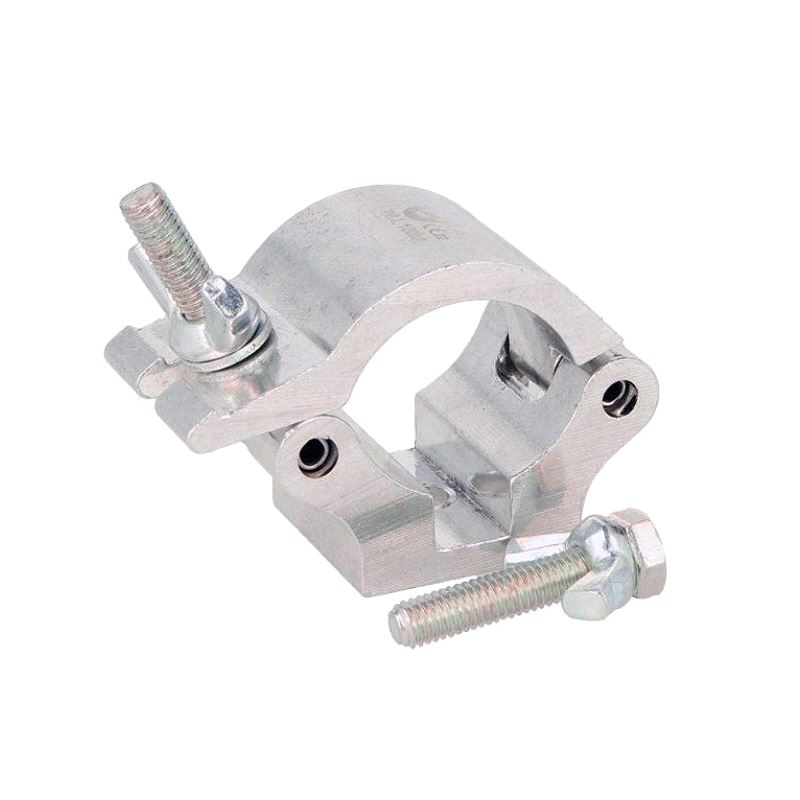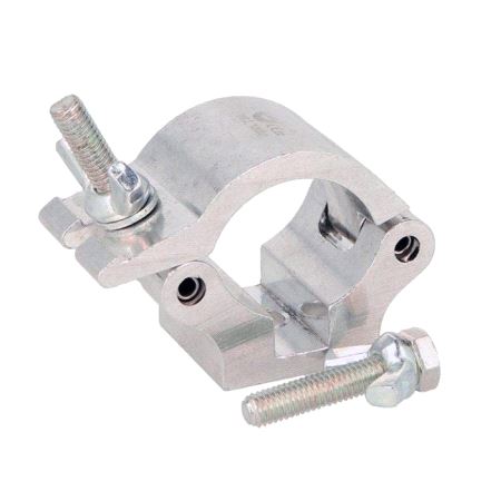 A high tensile extruded aluminium clamp that is suitable for 32mm diameter tubes. It has a WLL of 100Kg and is 30mm wide. Slotted to hold captive an M6 nut or bolt head and supplied with an M6 X 30 bolt and wing nut. Ideal for decorative trussing as it will not damage the cords. Available in polished silver or powder coated black.