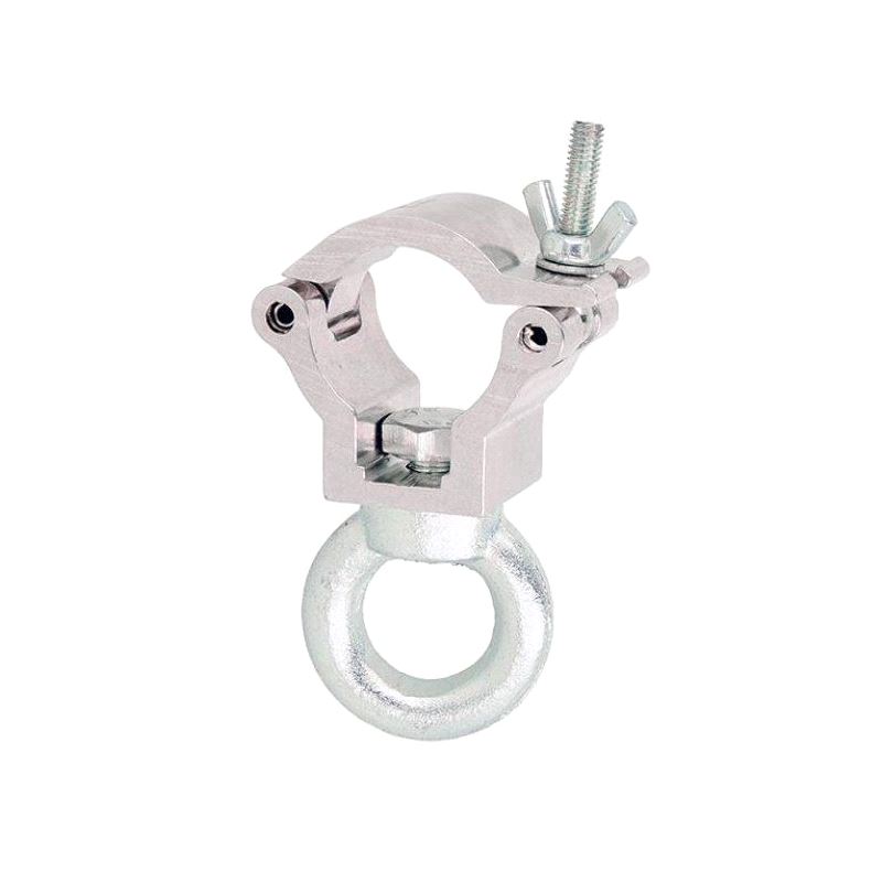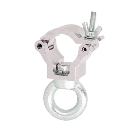 A high tensile extruded aluminium clamp that is suitable for 35mm diameter tubes. It has a WLL of 100Kg and is 30mm wide factory fitted with an M10 Eye Nut. Ideal for decorative trussing as it will not damage the cords. Available in polished silver or powder coated black.