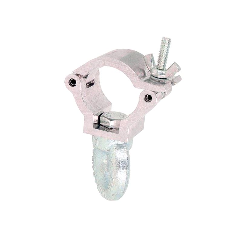 A high tensile extruded aluminium clamp that is suitable for 38mm diameter tubes. It has a WLL of 100Kg and is 30mm wide factory fitted with an M10 Eye Nut. Ideal for decorative trussing as it will not damage the cords. Available in polished silver or powder coated black.