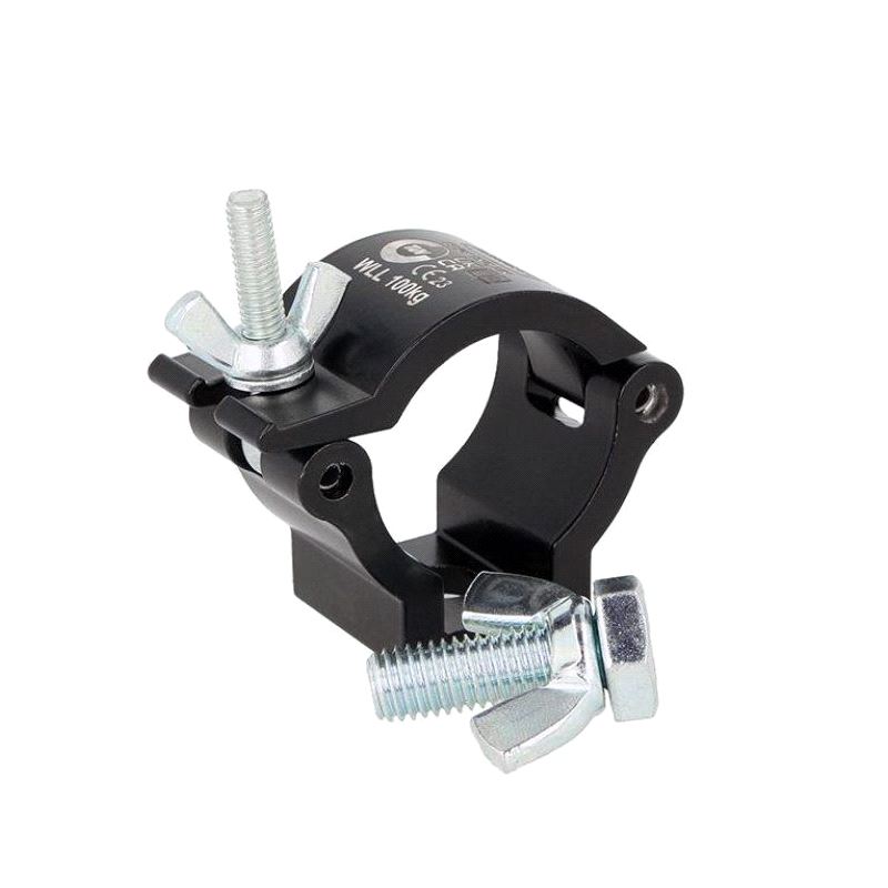 A high tensile extruded aluminium clamp that is suitable for 38mm diameter tubes. It has a WLL of 100Kg and is 30mm wide. Slotted to hold captive an M10 nut or bolt head and supplied with an M10 X 30 bolt and wing nut. Ideal for decorative trussing as it will not damage the cords. Available in polished silver or powder coated black.