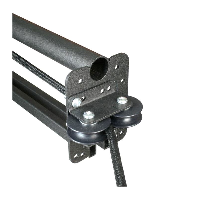 A mild steel Double Guide Pulley is fitted at 2.5m centres on straight sections and as with all Six Track components, this Pulley bolts straight on to the existing holes in the end of a Six Track section.