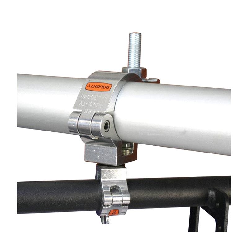 Consists of a pair of high tensile extruded aluminium clamps back to back designed to swivel. Suitable for 48mm to 51mm diameter tubes one end and 25mm tubes the other. Specifically designed to allow single track lengths to be mounted to trussing, scaffold tubes and lighting bars.