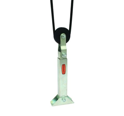 A mild steel Sprung Floor Pulley with a nylon sheave designed to maintain constant tension on manual hauling lines.
