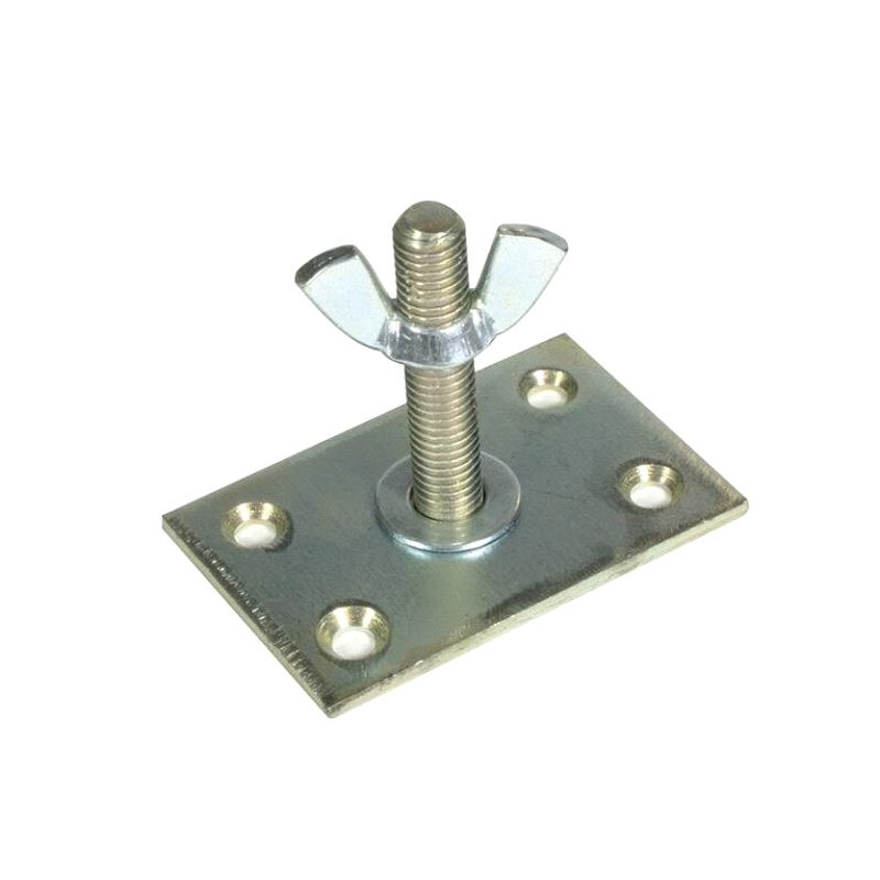A mild steel plate with an M10 stud in the centre and a BZP finish. Supplied with an M10 wing nut. Designed to be used bolted to timber with 4 X countersunk 6mm machine screws, nuts and washers. Always remember, the bracket is only as strong as the weakest part of the assembly which in this case is the timber.