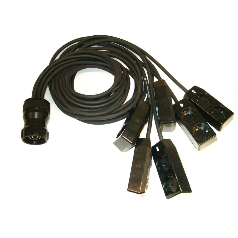 Uttaksforgreining (ut til lyskastere) fra en original Socapex 19 pin kontakt til 6 x 2.5mm2 lengder á 2=>12m med doble Schuko kontakter i enden. Leveres med krympestrømper for merking.