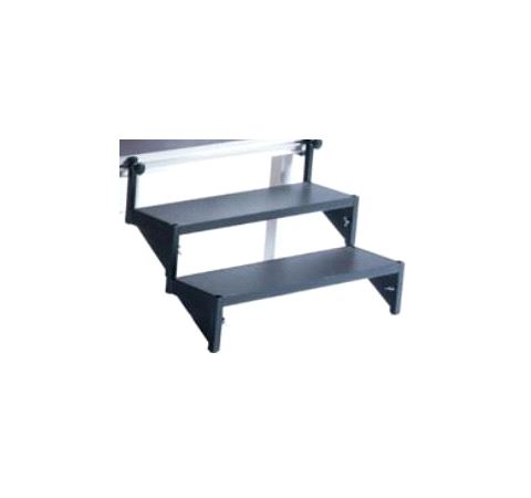 Trapp 1-trinns (modulbasert) med svart besiset overflate. Trappen har en bredde = 100 cm og høyde på 20 cm som monteres fast i profilen på podiet (=> scenehøyde = 40 cm). Nødvendig festemateriell følger med ved bestilling.